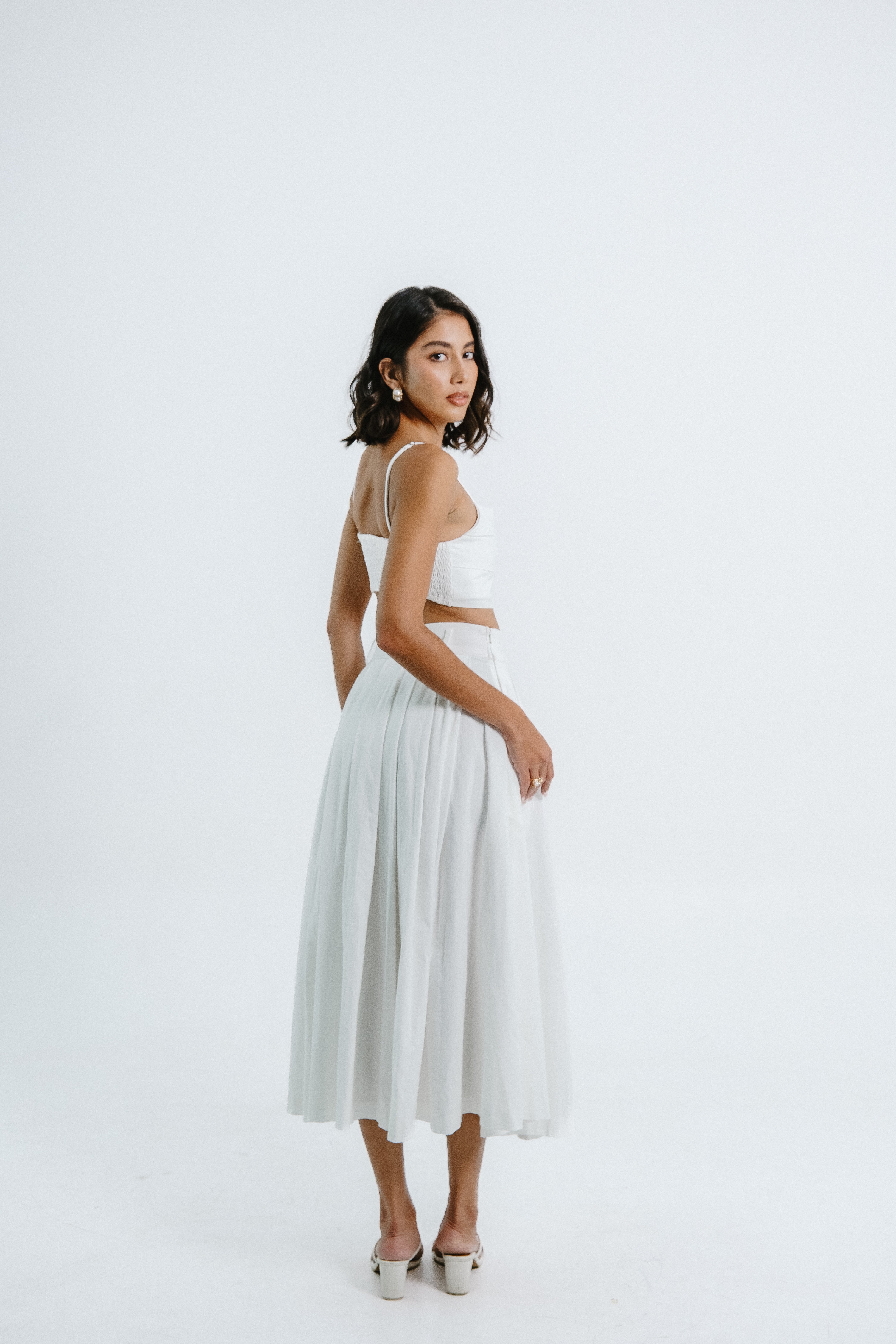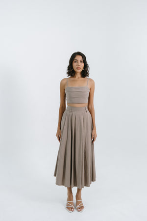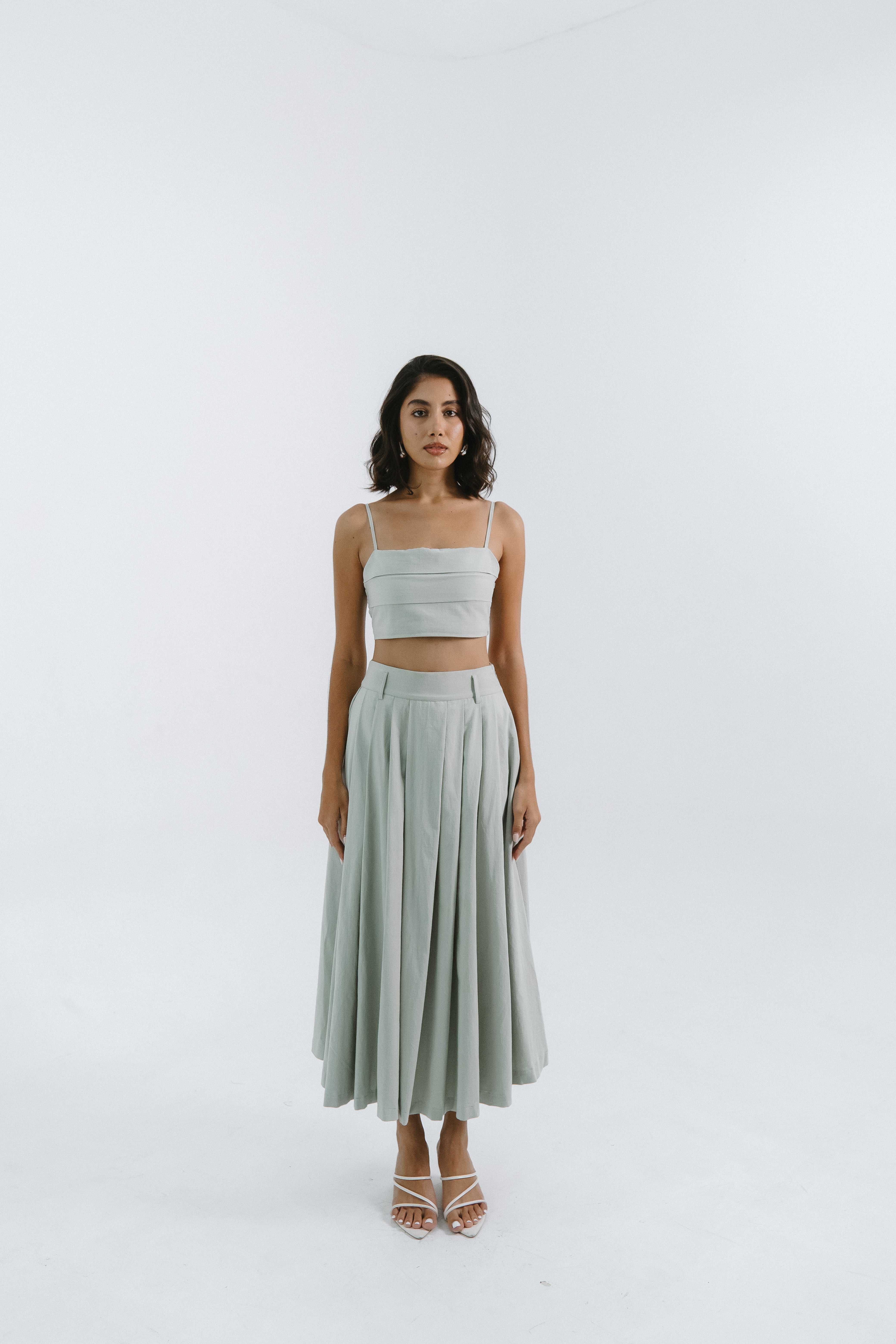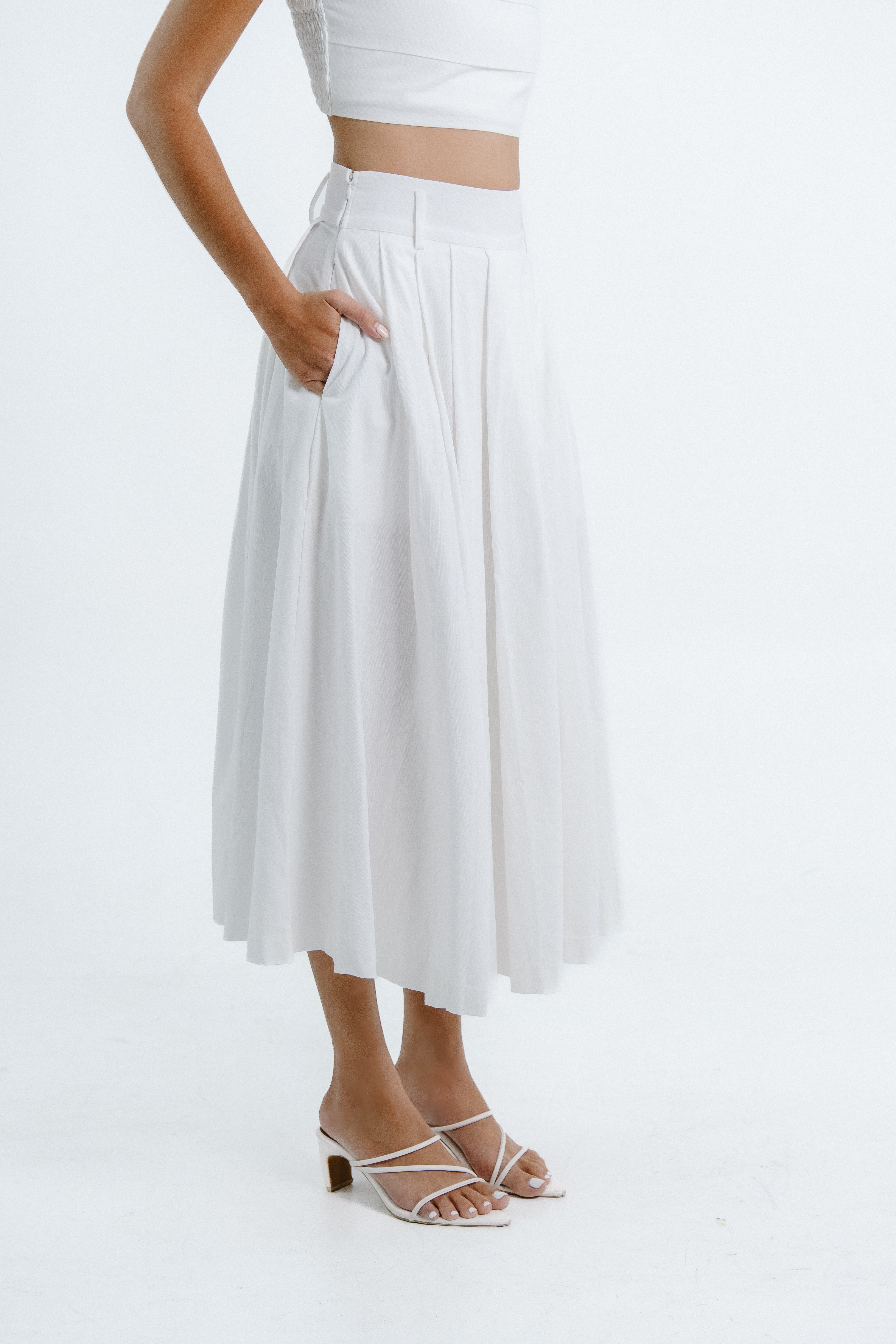 The Caelia Skirt is a refined A-line midi skirt crafted from 100% cotton, offering both comfort and graceful structure. Designed with soft structured pleats from the waistband, it flows beautifully while maintaining an elegant silhouette. The high-rise waistline accentuates the figure, while side seam pockets add a subtle touch of functionality. Versatile and timeless, the Caelia Skirt transitions effortlessly from day to evening — embodying understated sophistication and modern femininity.