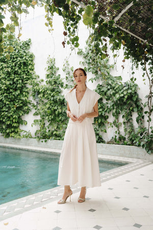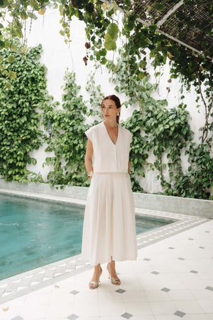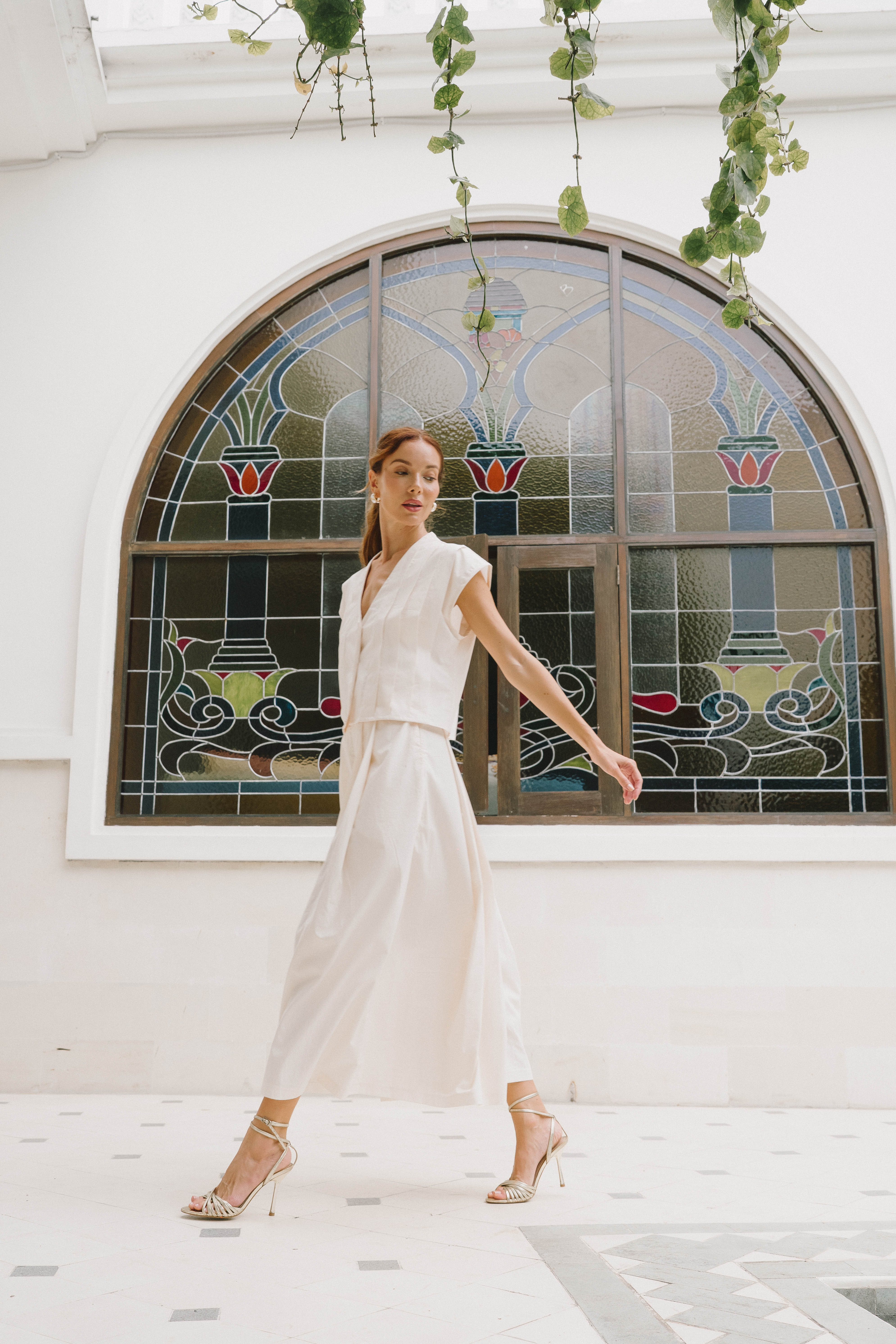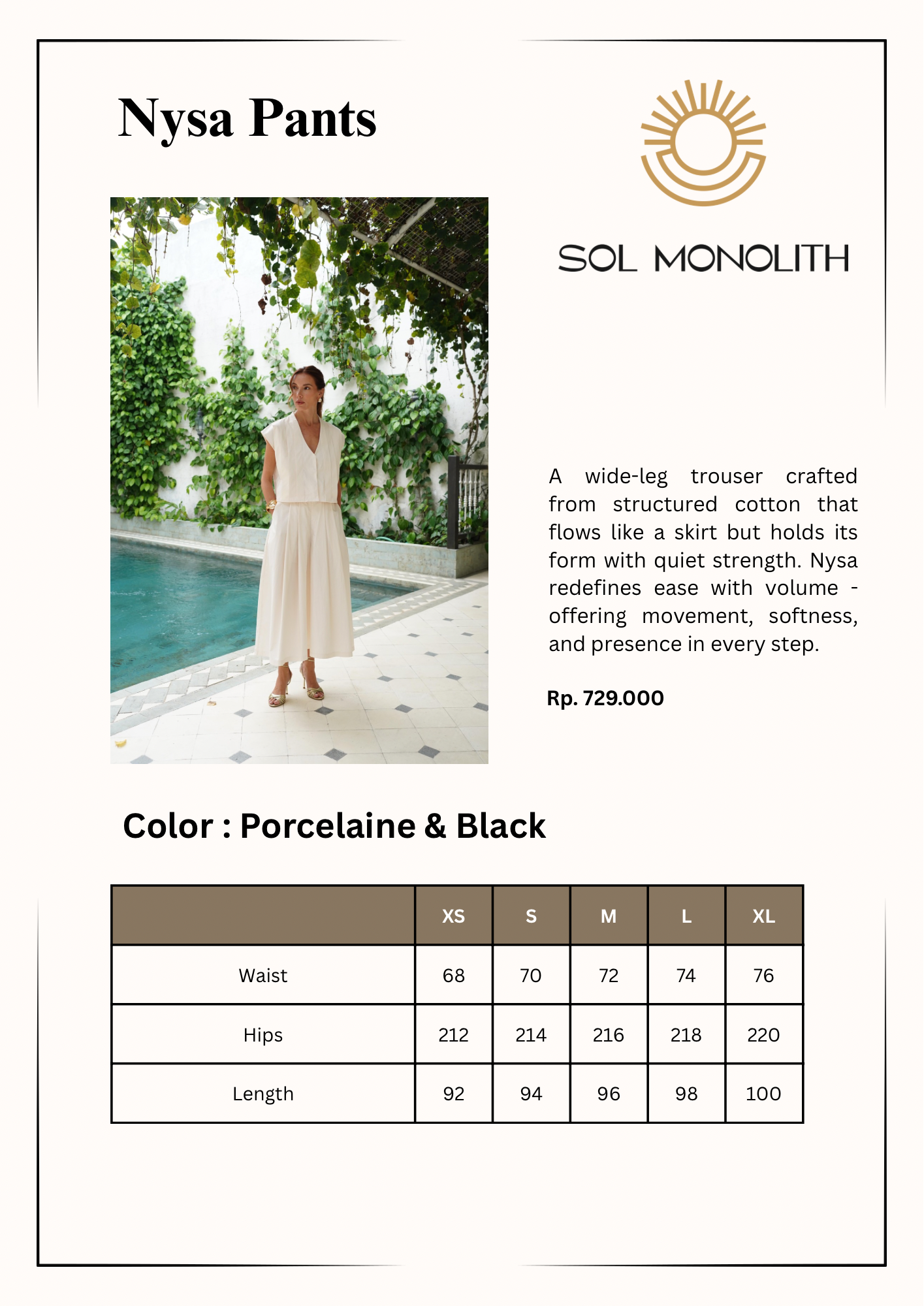 A wide-leg trouser crafted from structured cotton that flows like a skirt but holds its form with quiet strength. Nysa redefines ease with volume – offering movement, softness, and presence in every step.
