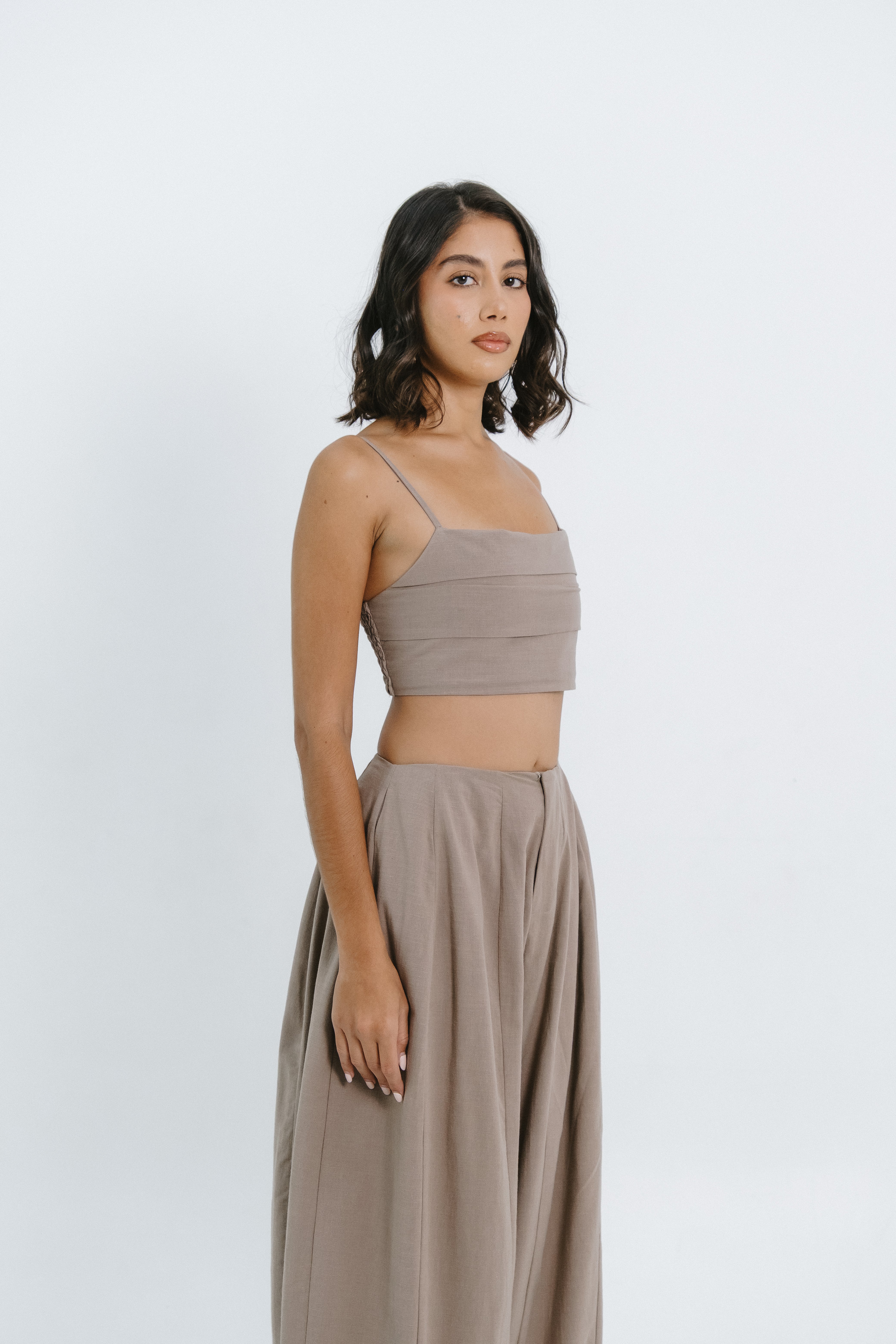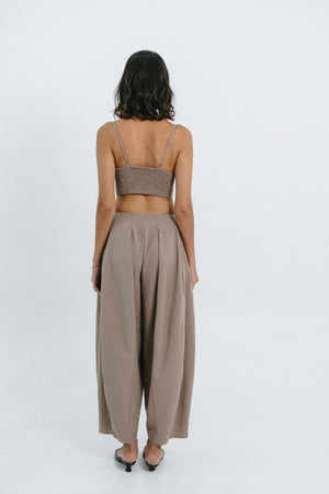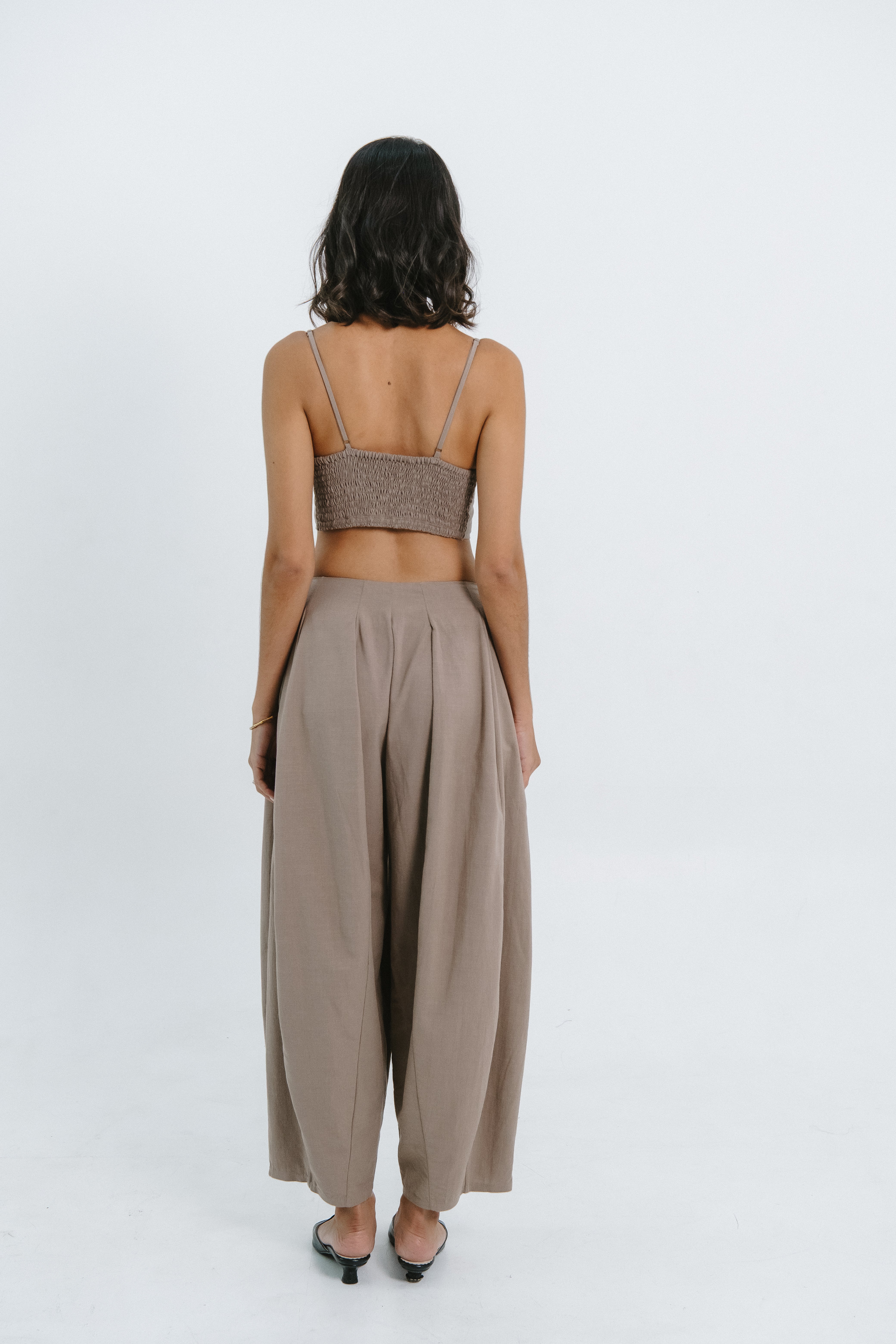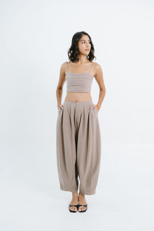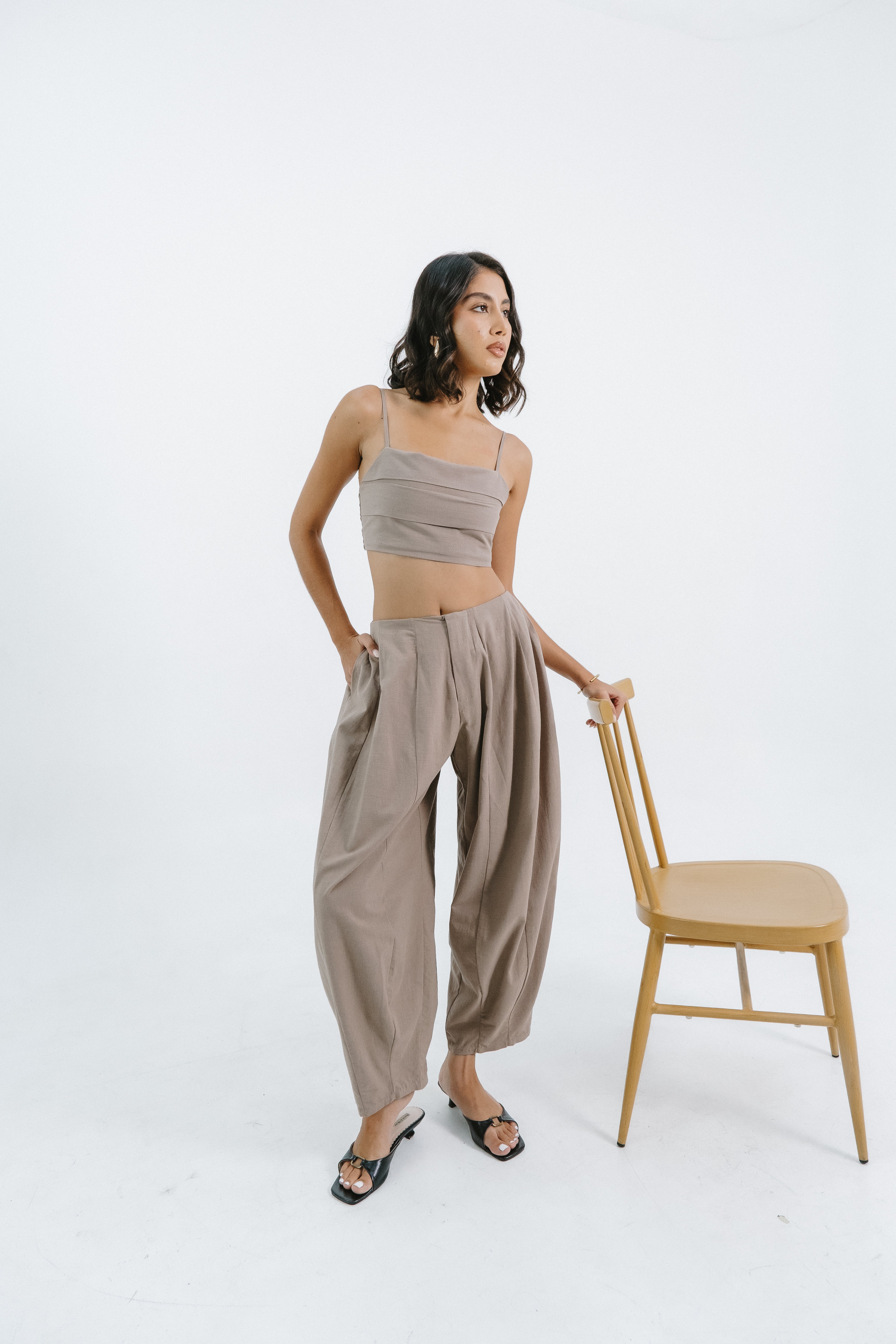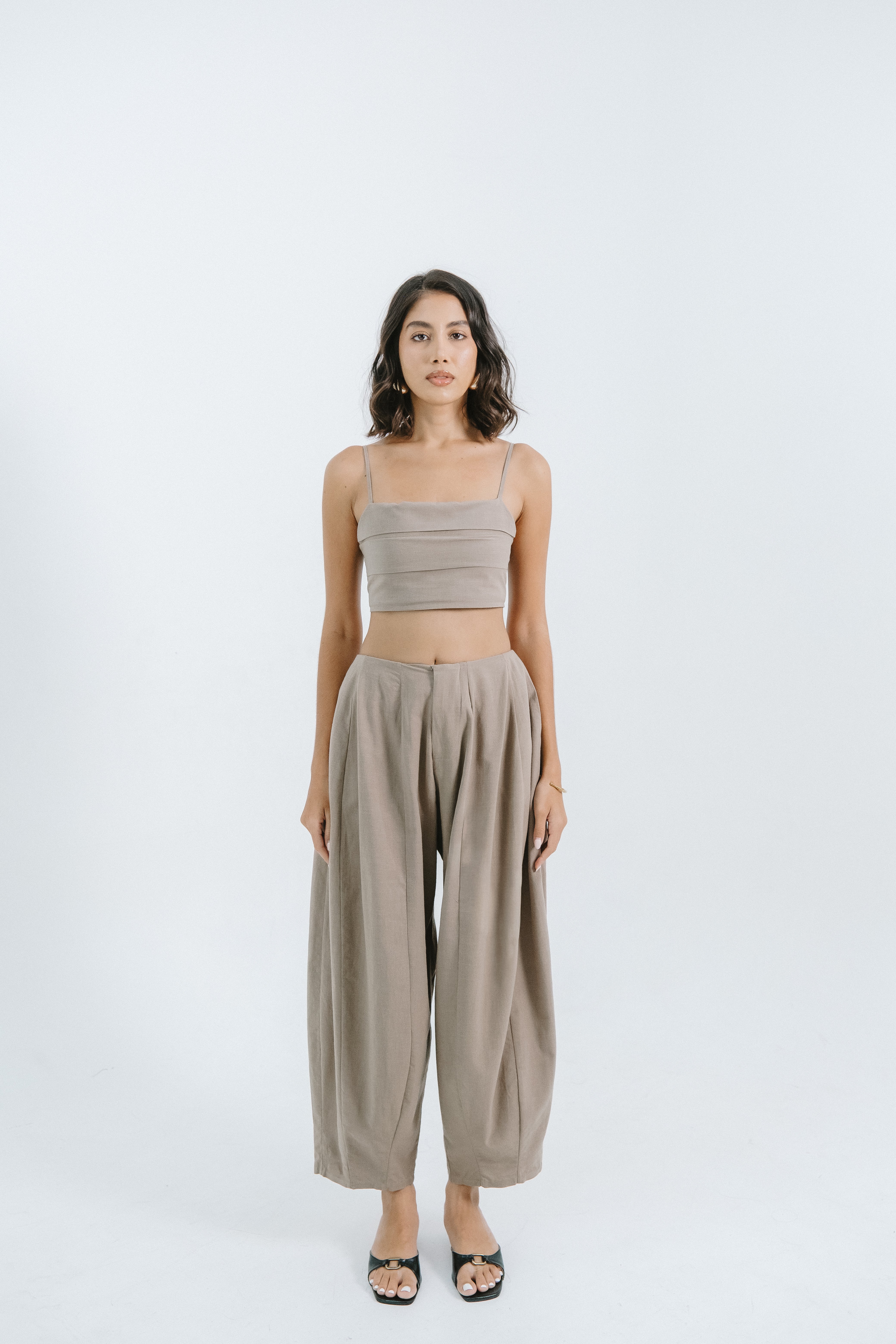 Sculpted Balance Set seamlessly fuses architectural precision with effortless ease. The set features a sleek bandeau top that offers minimalist sophistication, while the balloon trousers add a soft, voluminous contrast that moves gracefully. The combination of structured panels and relaxed volume creates a modern balance of form and fluidity, elevating the essence of simplicity.