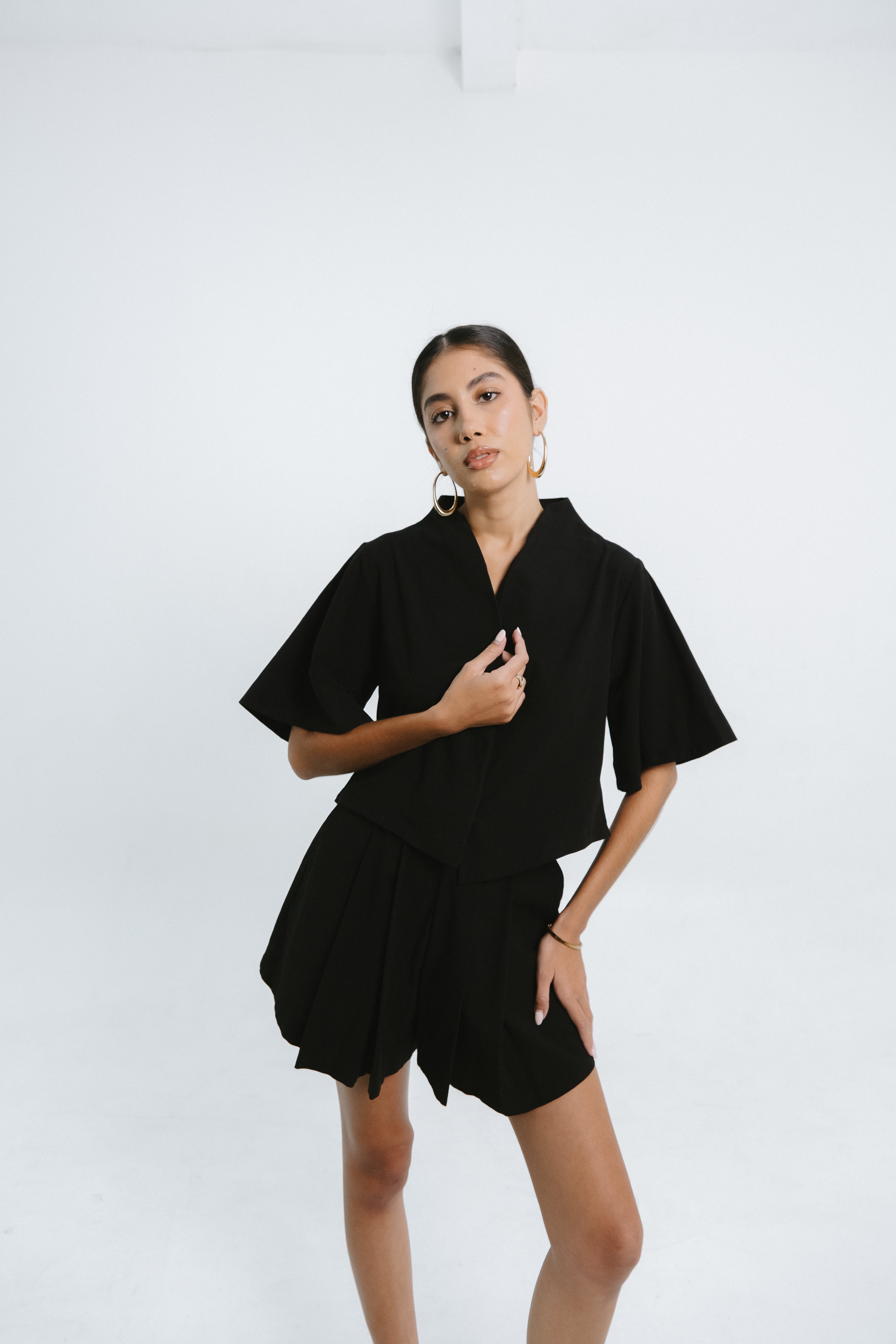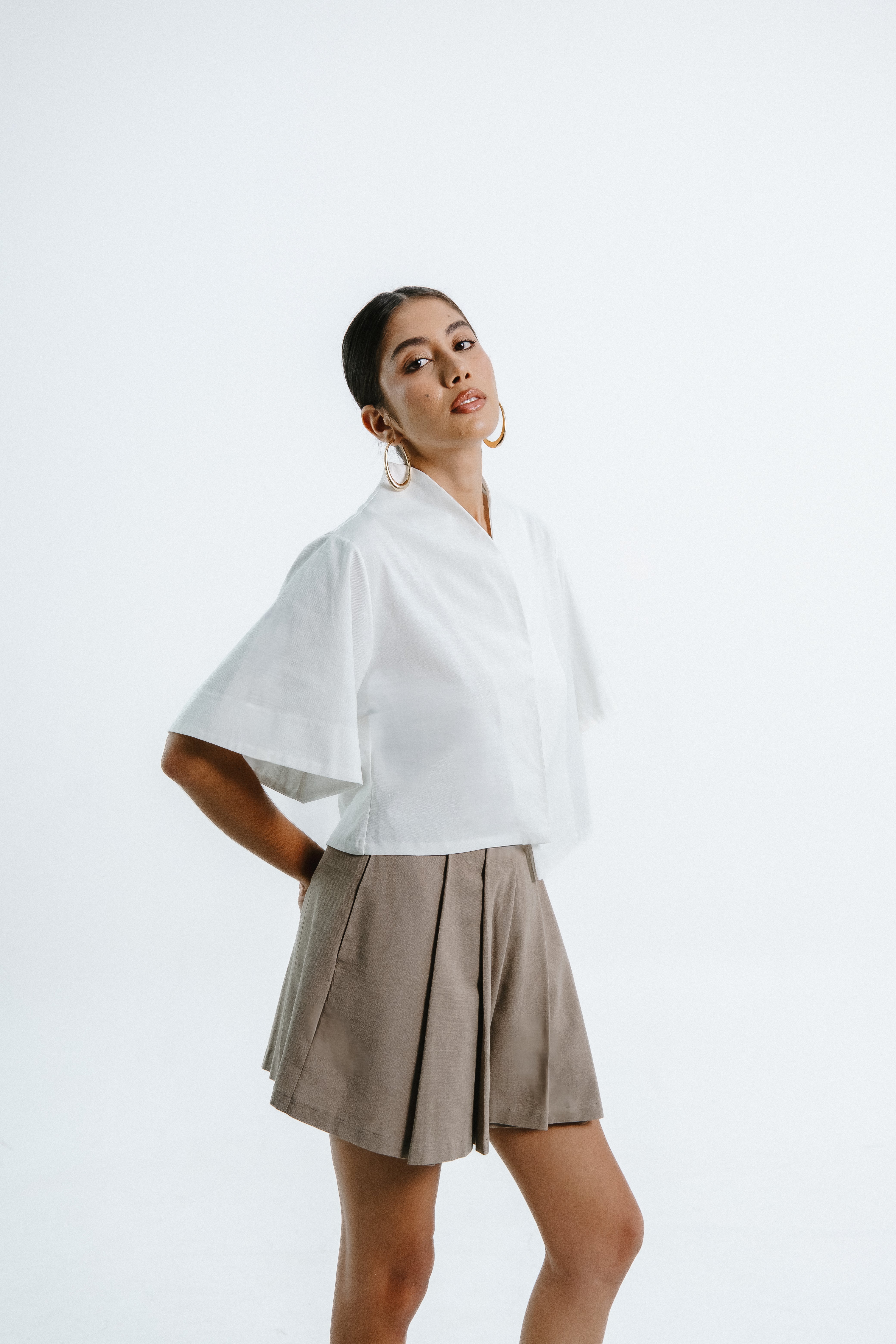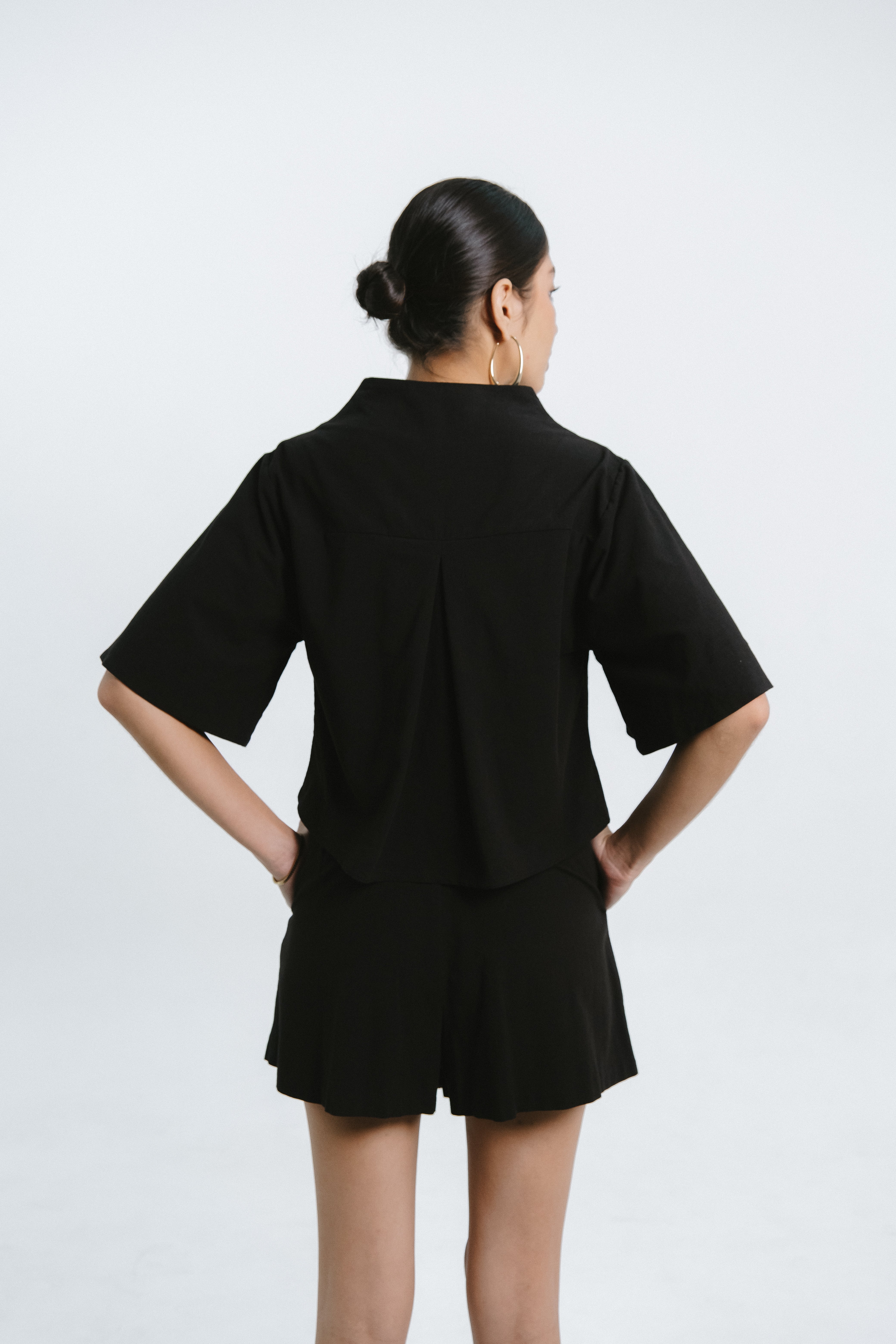 Quiet Form Set blends effortless grace with subtle sophistication. The minimalist silhouette of the boxy top features a mandarin collar that frames the face with modern elegance, while its relaxed fit and slightly cropped length exude a sense of casual refinement. Paired with high-waisted pleated shorts, the set offers sharp, tailored structure that complements the soft flow of the fabric. Available in Offwhite & Sandstone and All Black, this set strikes a perfect balance of quiet form and effortless grace, making it versatile enough for both elevated casual days and relaxed evenings. Stylish, understated, and timelessly chic.
