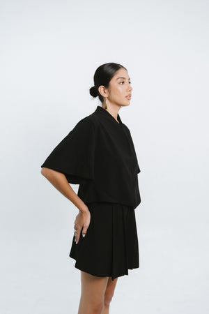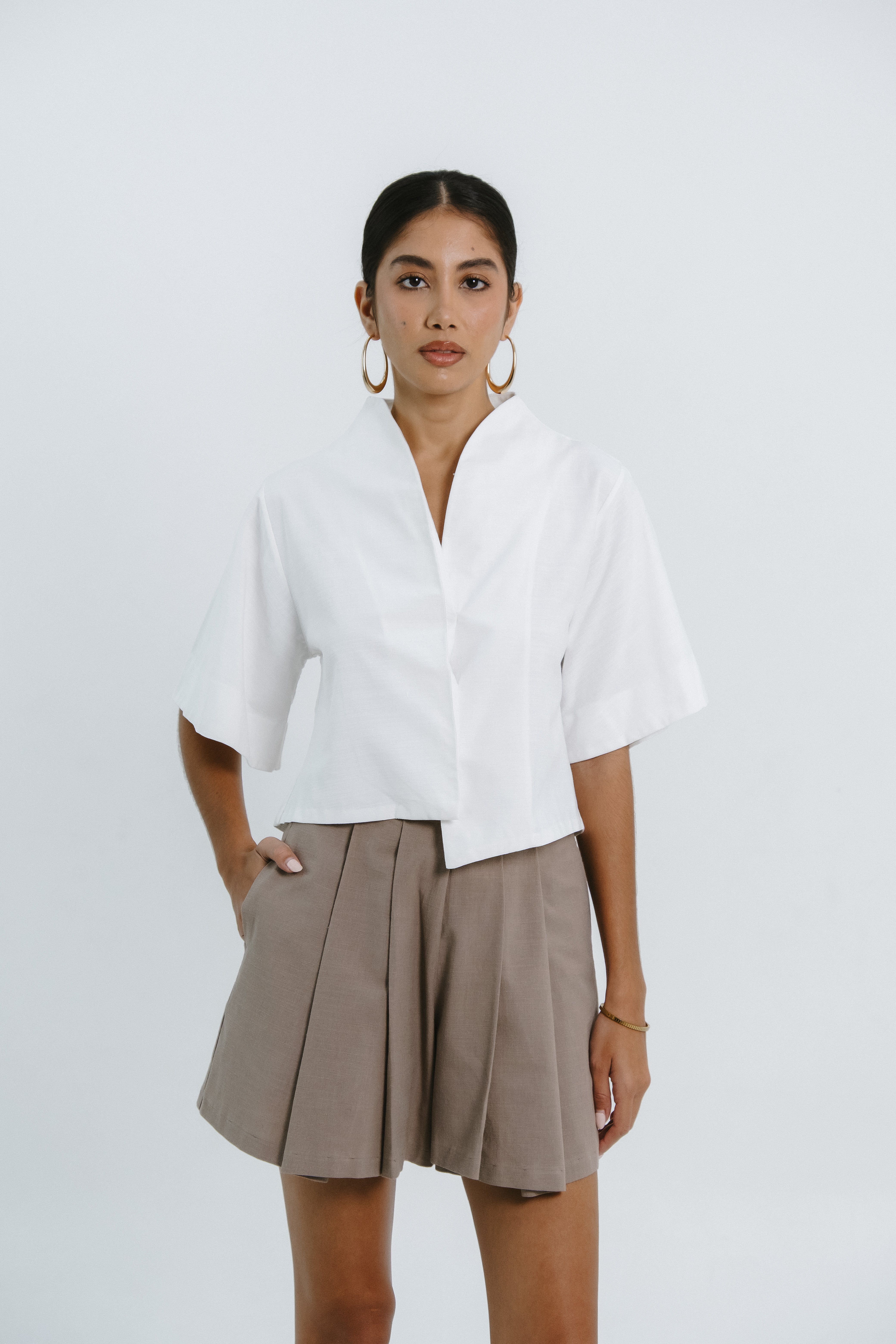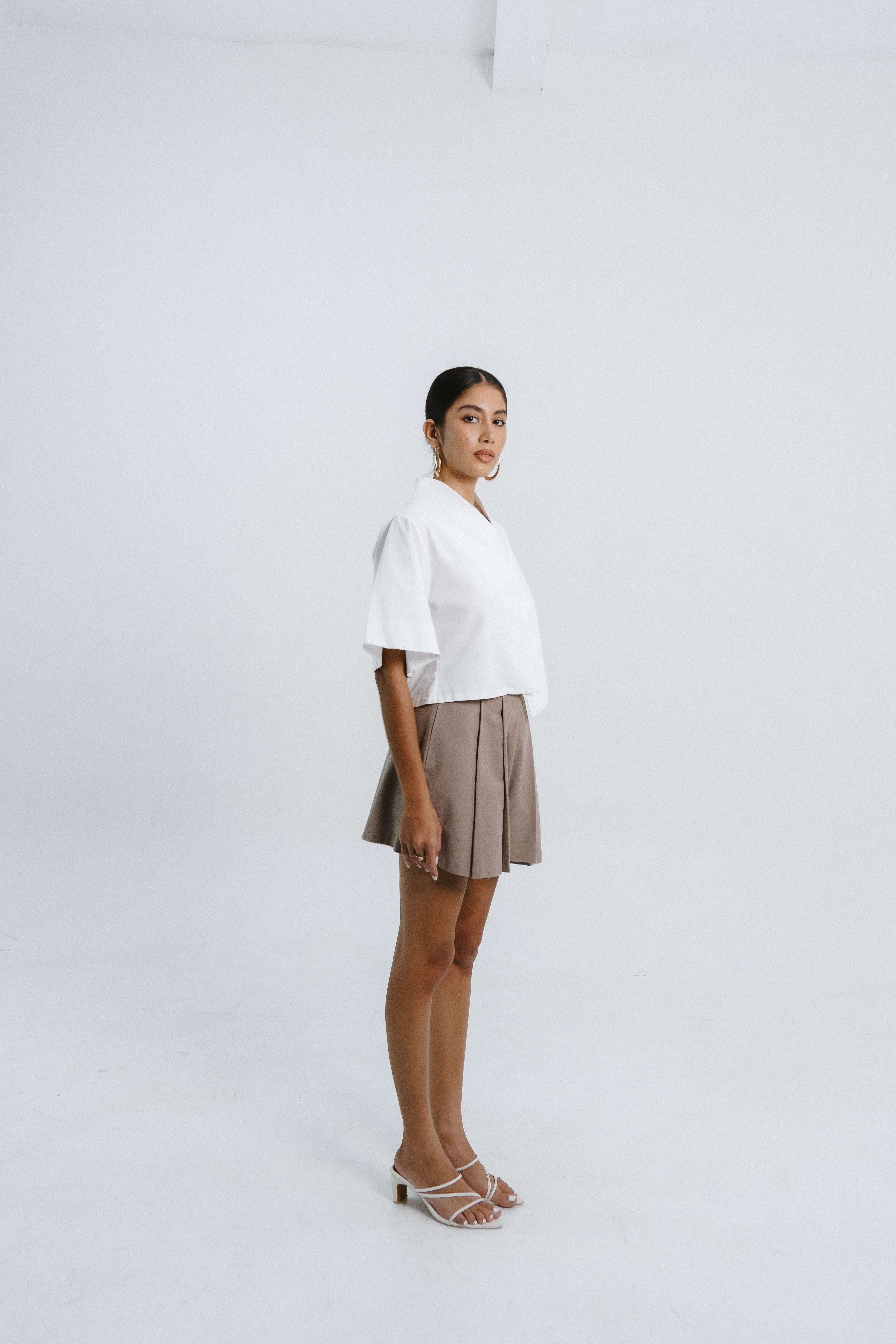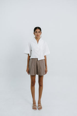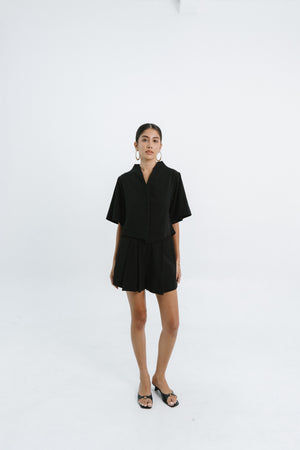 Quiet Form Set blends effortless grace with subtle sophistication. The minimalist silhouette of the boxy top features a mandarin collar that frames the face with modern elegance, while its relaxed fit and slightly cropped length exude a sense of casual refinement. Paired with high-waisted pleated shorts, the set offers sharp, tailored structure that complements the soft flow of the fabric. Available in Offwhite & Sandstone and All Black, this set strikes a perfect balance of quiet form and effortless grace, making it versatile enough for both elevated casual days and relaxed evenings. Stylish, understated, and timelessly chic.